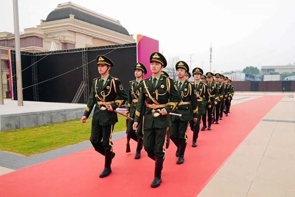 红毯铺地刀旗飘扬,国旗护卫队夹道欢迎