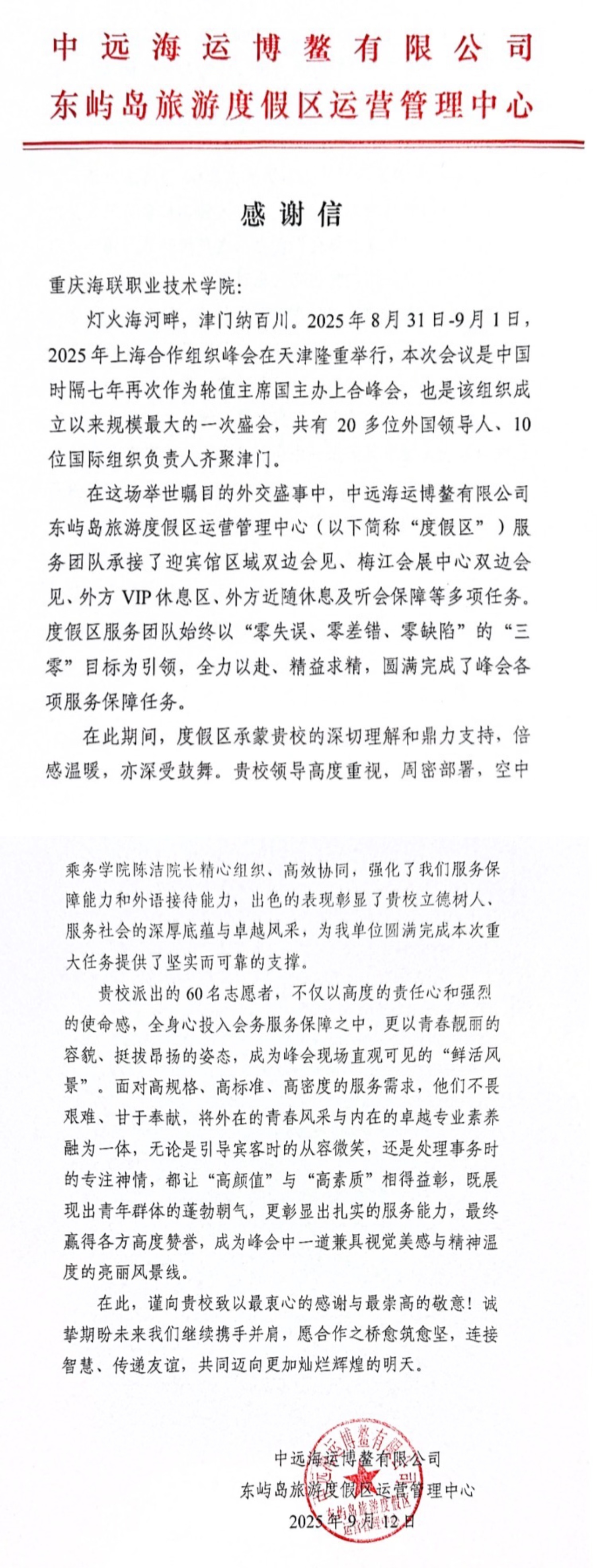 近日,学校收到来自中远海运博鳌有限公司东屿岛旅游度假区运营管理中心的感谢信,对我校60名海联学子在2025上海合作组织峰会中的卓越表现给予高度肯定。