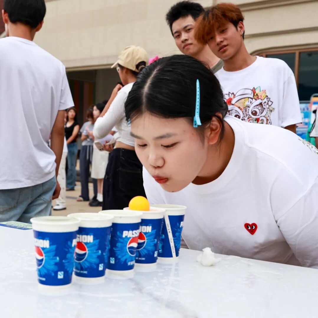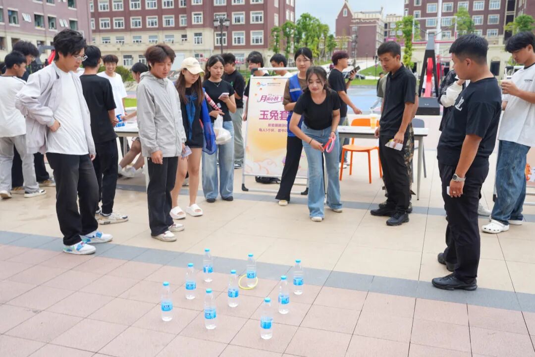 月宫投壶、玉兔套圈、仙人吹气、海底捞月、猜灯谜、古风变装、心语月愿七大趣味项目依次排开,每个摊位前都围满了跃跃欲试的学子,欢声笑语此起彼伏,成为校园里最亮眼的风景线。
