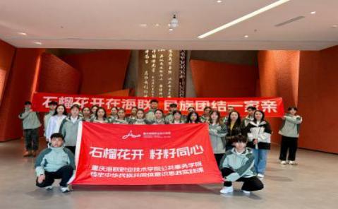 参观结束后,师生们齐聚在渣滓洞前。在雨中撑起“⽯榴花开在海联民族团结—家亲”的红色横幅,定格下这意义非凡的瞬间。此次红岩革命历史博物馆之行,为同学们上了—堂生动的思政课,激励着他们传承红色精神,在民族团结的大道上携手奋进。