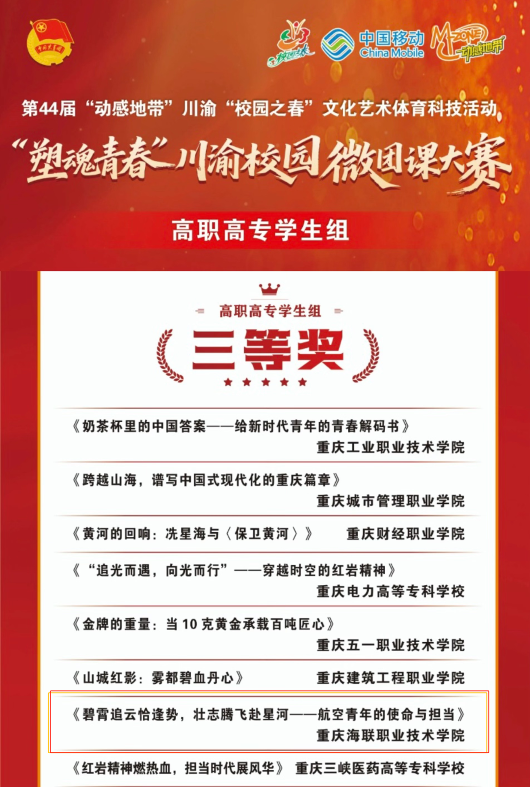 615日—16日,由团市委联合市委教育工委、市教委、市体育局、团四川省委、市科协、市学联、四川省学联主办的第44届“动感地带”川渝“校园之春”文化艺术体育科技活动之“塑魂青春”川渝校园微团课大赛决赛圆满落幕。经过激烈角逐,由曾夏、黄倩老师指导、蒋慧婷老师带队,来自航空工程学院的全英豪、李渝、曹慧如、张涛、胡洪御同学参演的微团课作品《碧霄追云恰逢势,壮志腾飞赴星河——航空青年的使命与担当》荣获高职高专学生组三等奖。