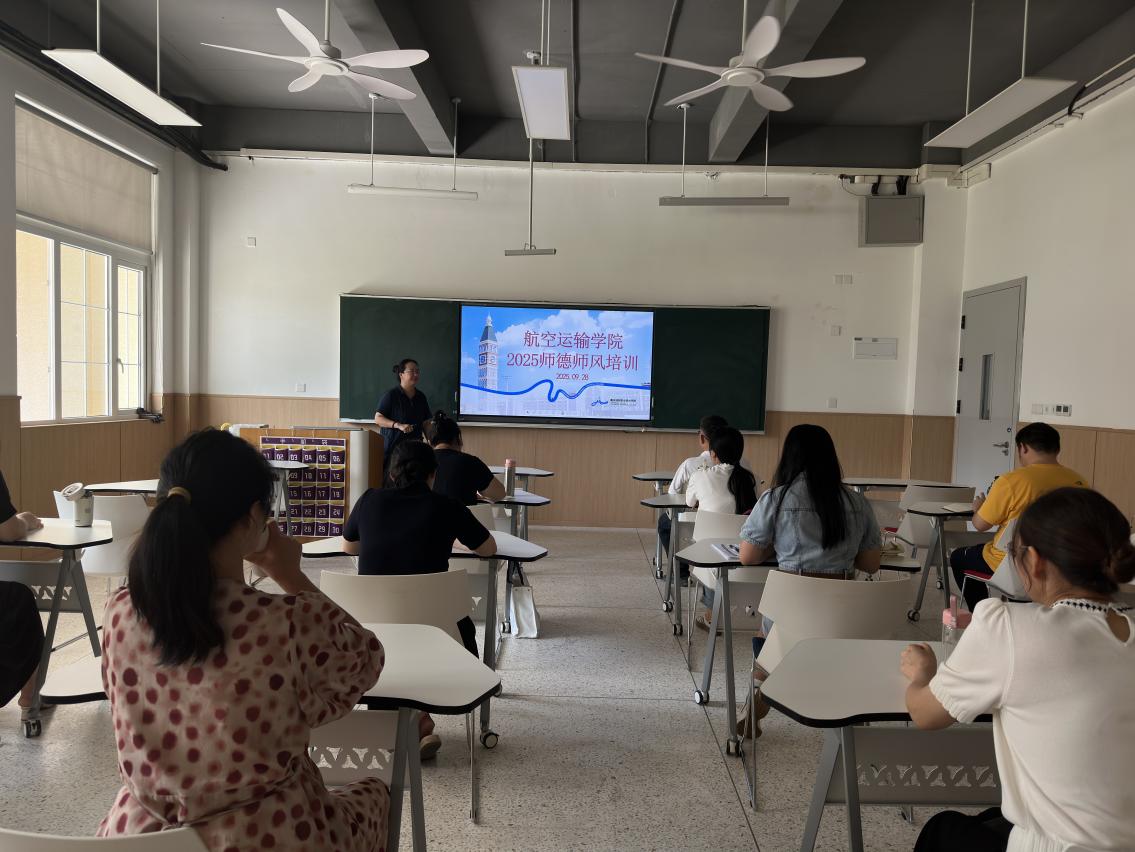 2025 年 9 月 28 日,航空运输学院聚焦师资队伍建设,组织开展师德师风专题培训,旨在以系统化培训强化教师职业道德素养,推进师德师风建设规范化、系统化,为航空运输领域人才培养筑牢 “德” 字根基。全院教职工参加培训。