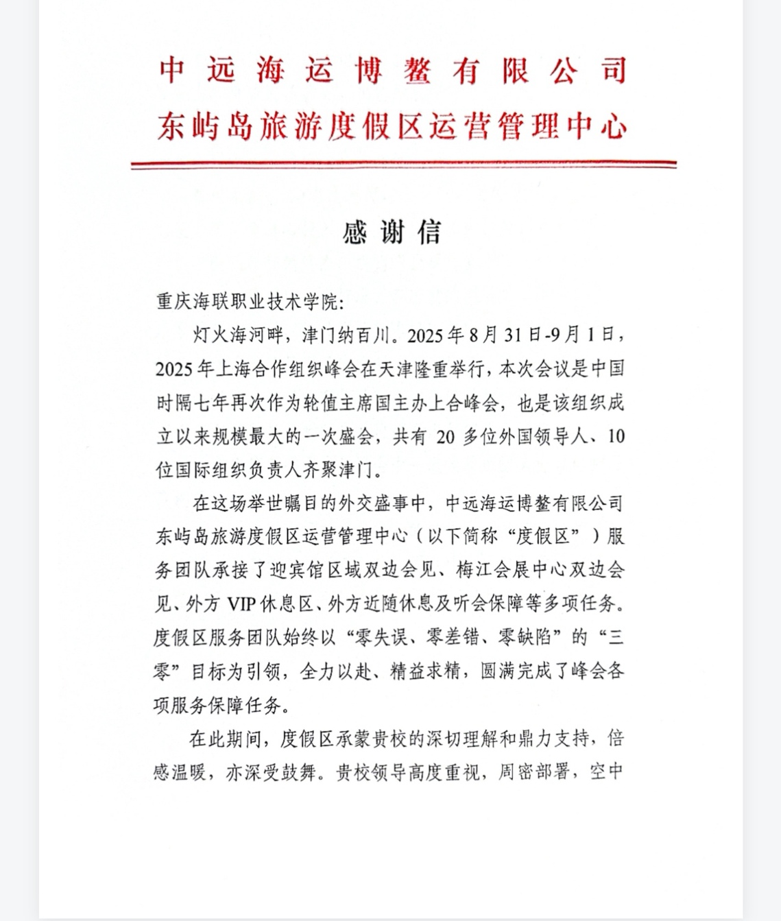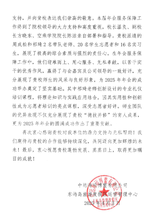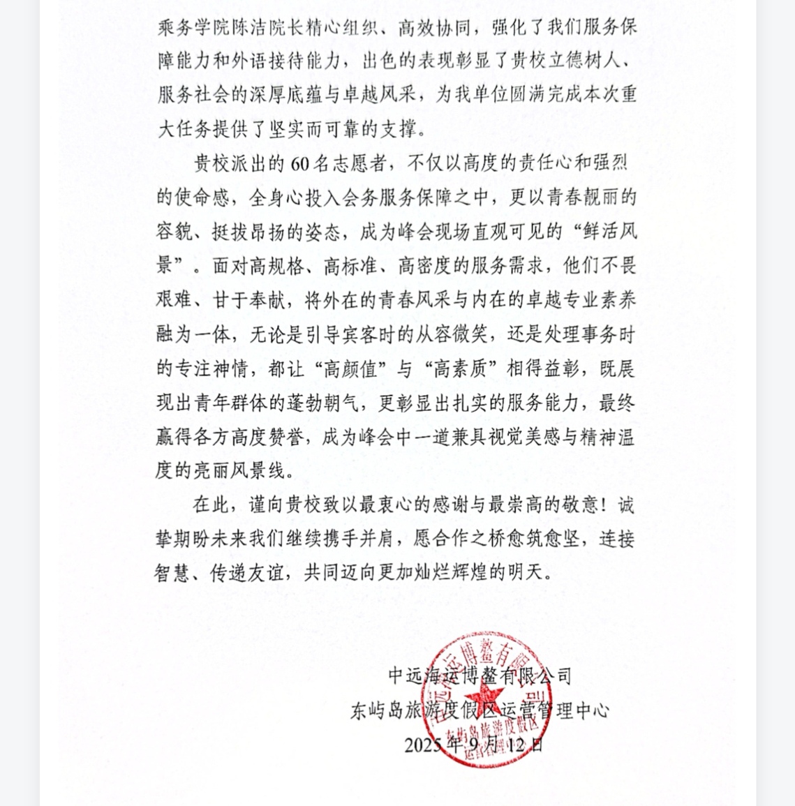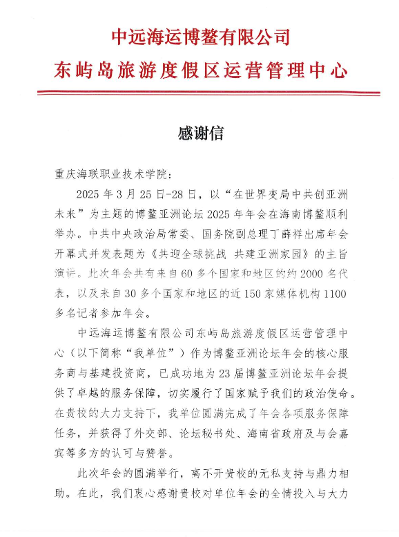 近日,学校收到来自中远海运博鳌有限公司东屿岛旅游度假区运营管理中心的感谢信,信中表扬了海联师生在3月25日至28日博鳌亚洲论坛2025年年会期间,真情服务、坚守岗位,全面配合各项工作的优质品质。