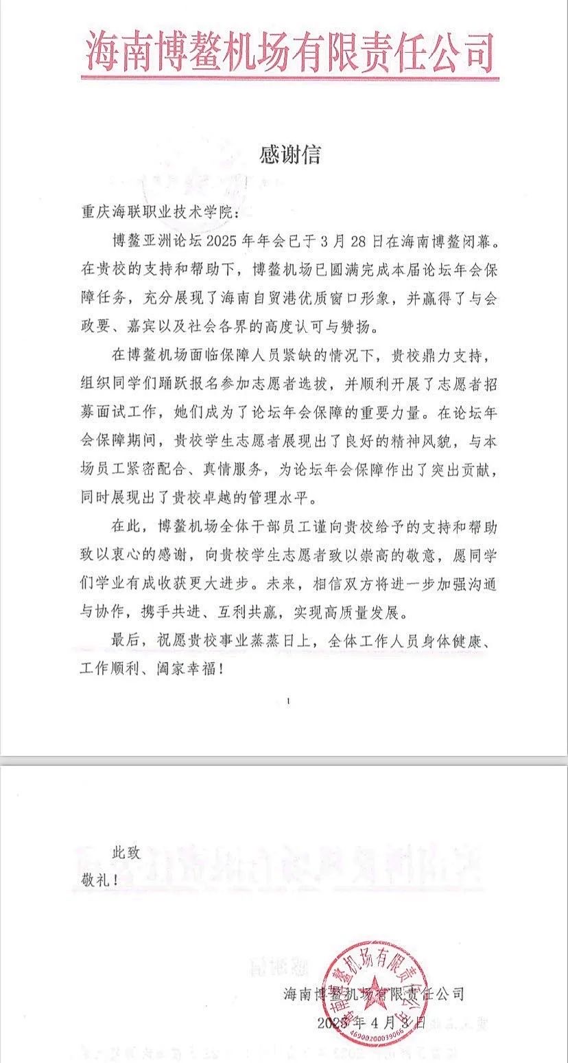 第二封来自海南博鳌机场管理有限公司的感谢信,再次对我校志愿者高标准的服务工作点赞!信中写道:在论坛年会保障期间,贵校志愿者展现出了良好的精神风貌,积极主动学习、团结协作意识强,与本场员工紧密配合、真情服务,为论坛年会保障做出了突出贡献,同时展现出了贵校卓越的管理水平。海联学子为保障各项会务工作顺心进行尽心尽力,用自己的实际行动彰显青春风采。