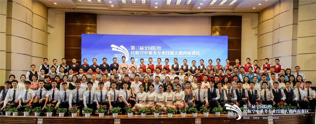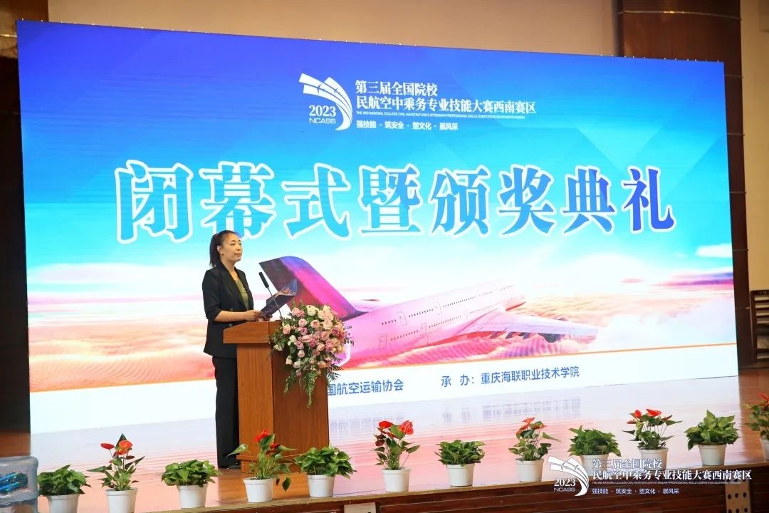 6月12日上午10点,第三届全国院校民航空中乘务专业技能大赛西南赛区闭幕式暨颁奖典礼圆满举行。中国航空运输协会翔宇公司副总经理段小云,中国航空运输协会科技培训部经理、航空运输协会培训业务西南区域负责人李超,大赛裁判长、国航培训部西南分部乘务培训中心训练项目经理黄昶明,中国AOPA航空职业教育分会秘书长陈宽,中国AOPA航空职业教育分会教学总监、重庆市航空航天类职业教育行业指导委员会副主任委员张峰琳,全体校领导,以及各参赛院系师生、我校师生代表出席了闭幕式。闭幕式由学校党委书记郭增琦主持。