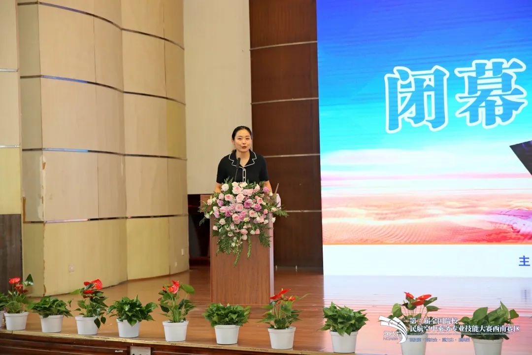 段小云女士在致辞中祝贺了本次大赛取得圆满成功,并强调本次大赛全面展示了民航职业教育教学成果,是贯彻党的二十大精神和落实“十四五”规划总体思路的具体行动,希望各院校以本次大赛为契机,加强交流学习,同学们要确立大目标、拓展大视野、培育大文化,以实际行动践行工匠精神和当代民航精神,坚定理想信念,练就过硬本领,投身民航事业,建功新时代。最后,段小云宣布第三届全国院校民航空中乘务专业技能大赛西南赛区闭幕!
