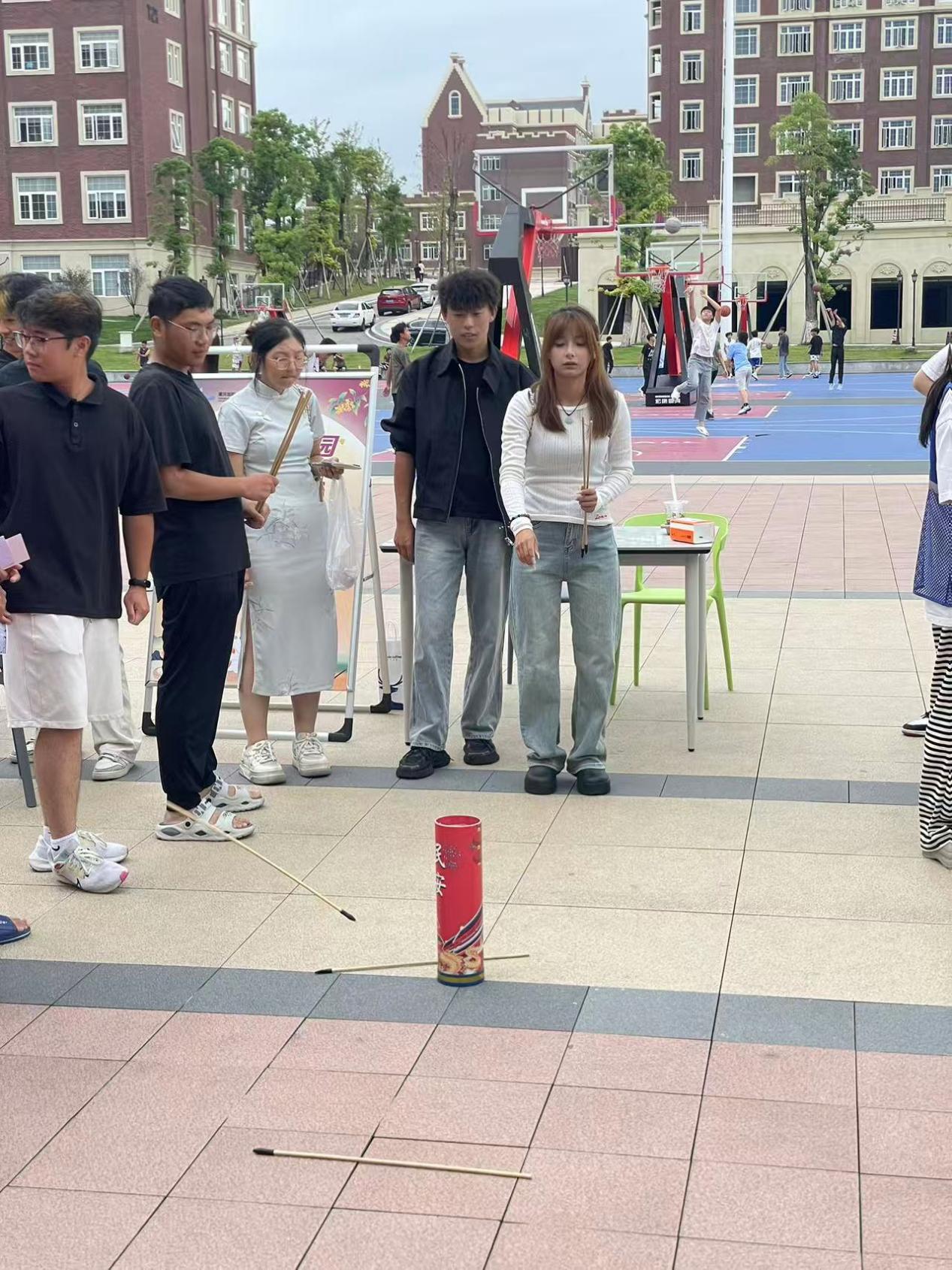 游园会设置了多项传统趣味游戏,让同学们在玩乐中感受传统文化的韵味。投壶游戏前,不少同学排队参与,大家手持箭矢,瞄准壶口,体验古人的娱乐方式。这个游戏不仅考验眼力和手力,还充满了竞技的乐趣,现场不时传来阵阵欢呼。