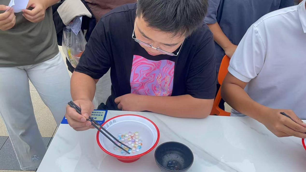 筷子夹珠子游戏也深受大家喜爱,参与者需要用筷子将不同颜色的珠子从一个碗夹到另一个碗中,看似简单却十分考验耐心和技巧。大家专注的神情和偶尔的失误,都让这个游戏充满了趣味。