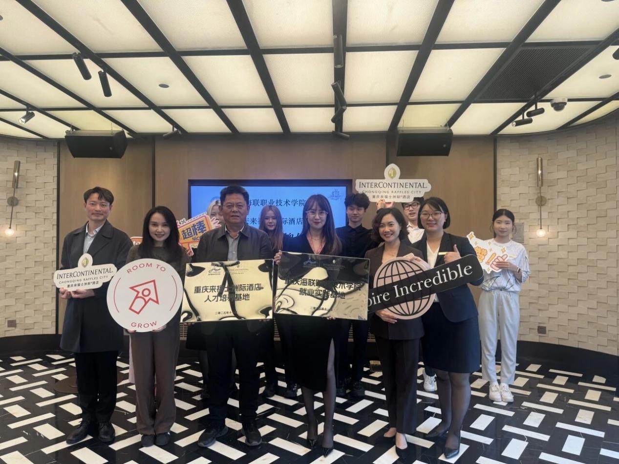 学校与重庆来福士洲际酒店举行人才培养、就业实践基地授牌仪式,标志着双方战略合作伙伴关系的正式确立。共话合作,共谋发展。我们期待双方在未来的合作中构建出与现代文旅产业体系相适应的育人新范式,为文旅产业高质量发展提供源源不断的人才支撑。