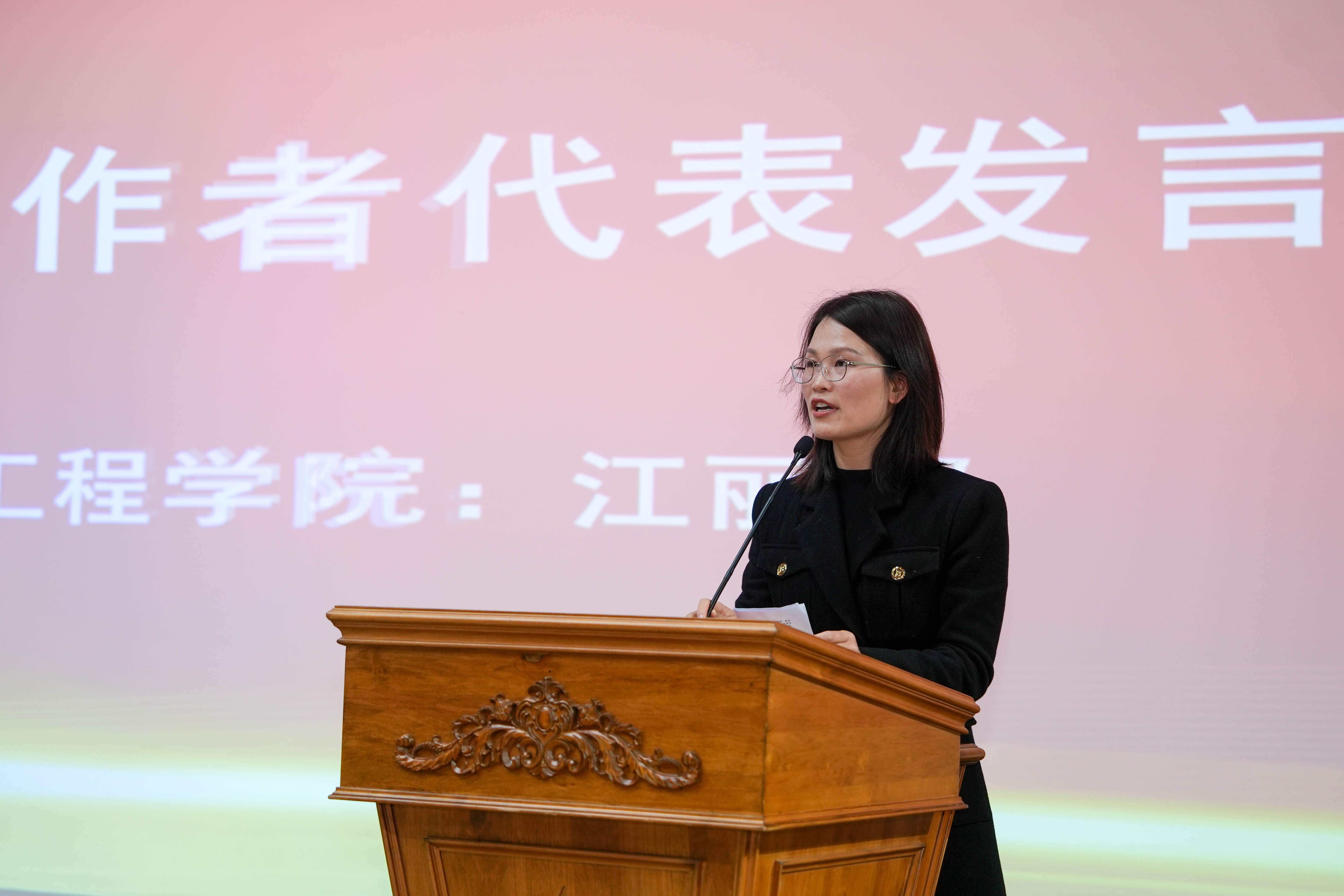 来自航空工程学院的江丽娜老师作为先进工作者代表在发言中分享了指导学生参与社会实践的心得体会。她表示,作为一名教育工作者,最大的欣慰莫过于看到学生在实践中成长、在奉献中收获。她鼓励全体教师继续用心用情引导学生,把“爱党爱国爱校”的情怀融入每一次实践、每一堂课程,助力学生成长为有理想、有本领、有担当的时代新人。
