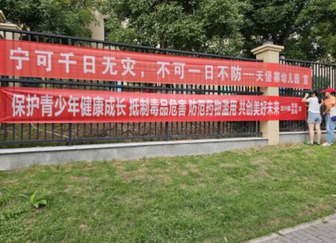 同时在社区主干道、宣传栏、活动广场等人流密集区域,悬挂起醒目的禁毒宣传横幅。
