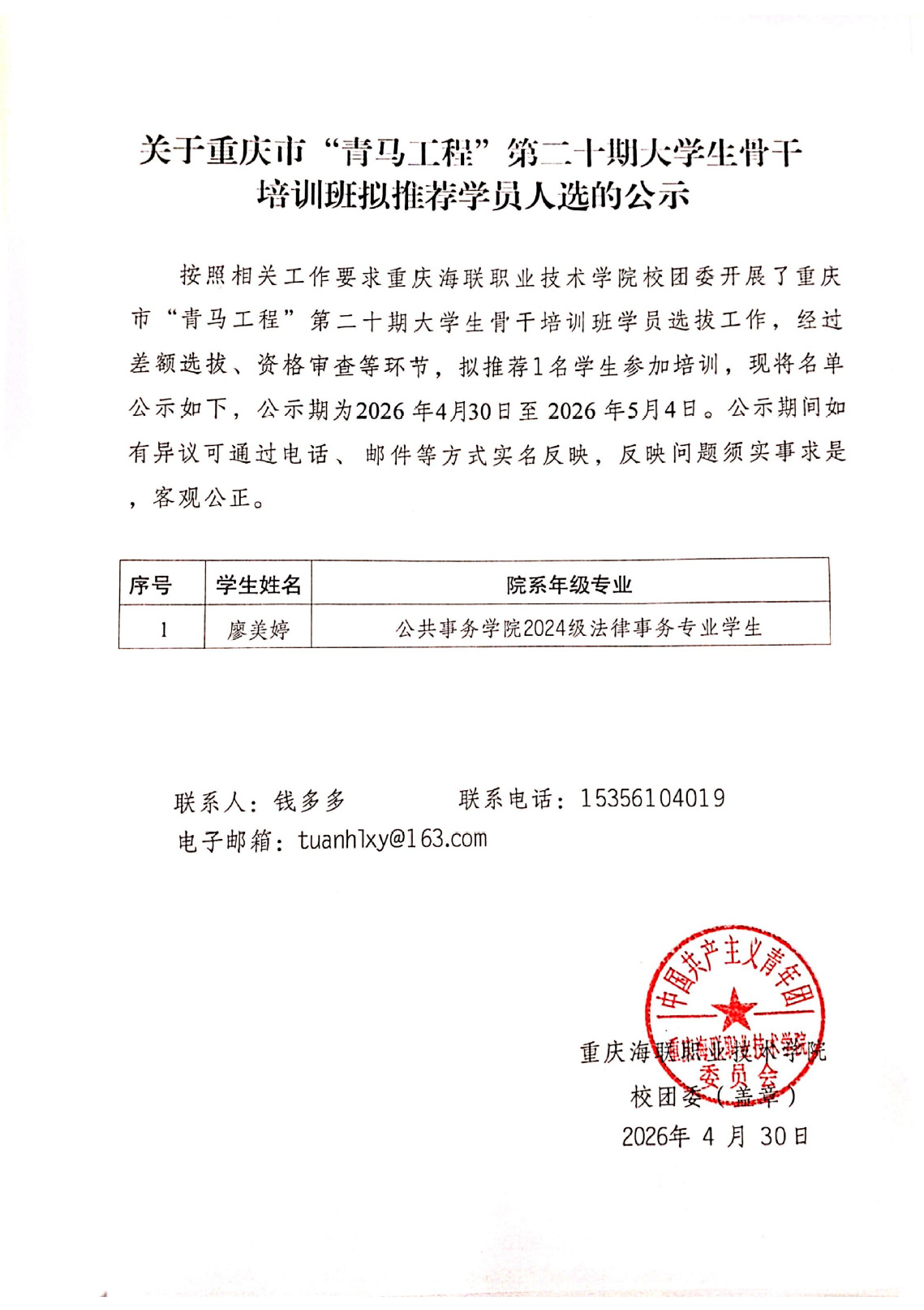 按照相关工作要求重庆海联职业技术学院校团委开展了重庆市“青马工程”第二十期大学生骨干培训班学员选拔工作,经过差额选拔、资格审查等环节,拟推荐1名学生参加培训,现将名单公示如下,公示期间如有异议可通过电话、 邮件等方式实名反映,反映问题须实事求是,客观公正。